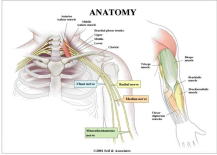 The brachial plexus consists of the nerve roots of spinal cord segments C5, C6, C7, C8, and T1. (See accompanying diagram). These nerve roots form three trunks which divide into anterior and posterior divisions. The upper trunk is made up of nerves from C5 and C6, the middle trunk from undivided fibers of C7, and the lowermost trunk is made up of nerves from C8 and T1.