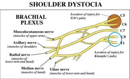 The most common serious complication following a shoulder dystocia delivery is brachial plexus injury. This is when the nerves in a baby's neck--the brachial plexus—are temporarily or permanently damaged. The nerves of the brachial plexus control the function of the arm and hand. Injury to the upper part of the brachial plexus is called Erb palsy while injury to the lower nerves of the plexus is called Klumpke palsy. Both can cause significant, lifelong disability.